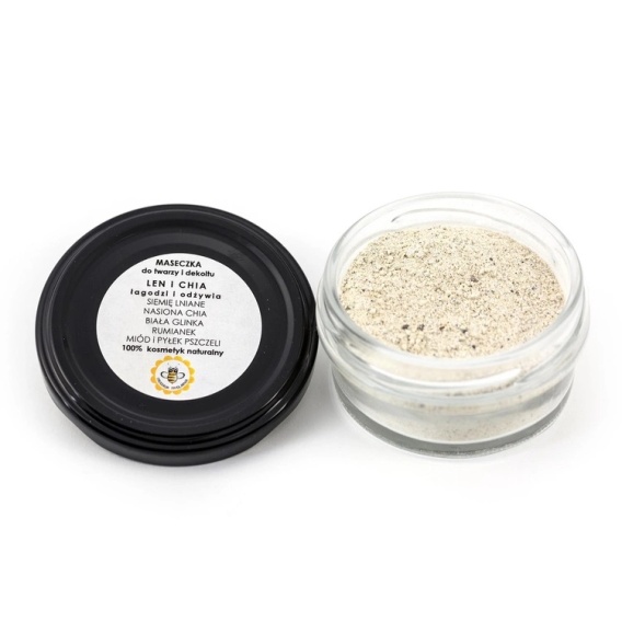 Składniki: biała glinka, siemię lniane, chia, pyłek pszczeli, miód w proszku, rumianek