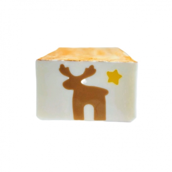 Ręcznie cięte mydło glicerynowe z reniferkiem i gwiazdką (ok. 100 g). Zapach mleka, jaśminu i wanilii zapewnia ciepłą, relaksującą atmosferę. Wysokiej jaakości baza glicerynowa nawilża i chroni skórę. Przyjemne, świąteczne i pachnące mydło.